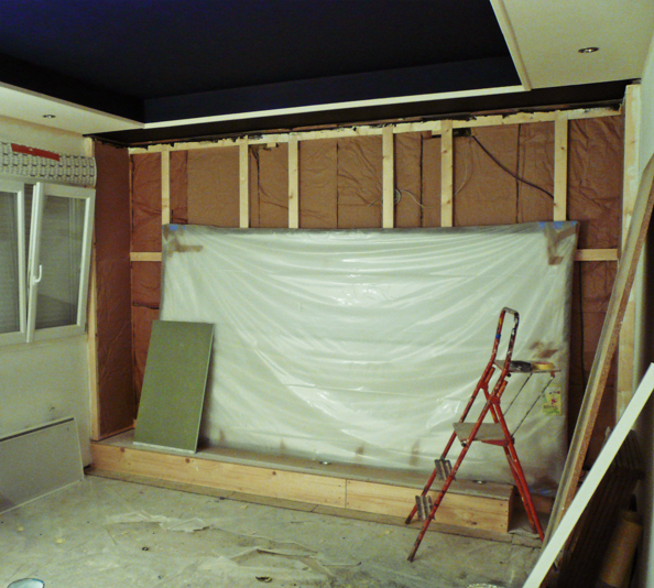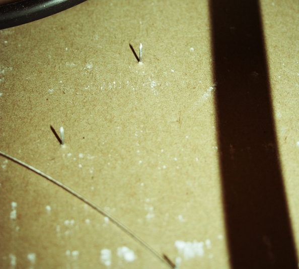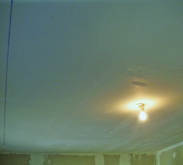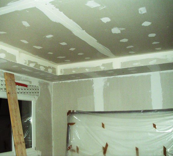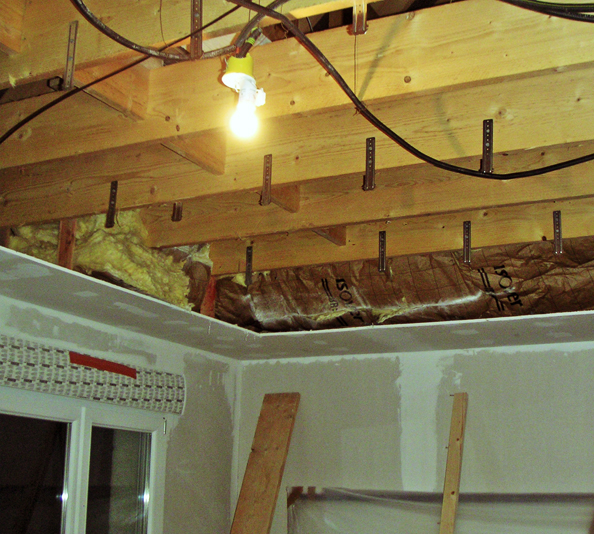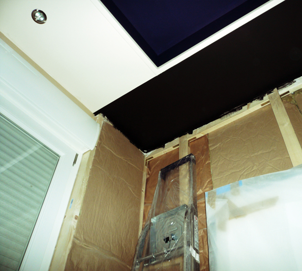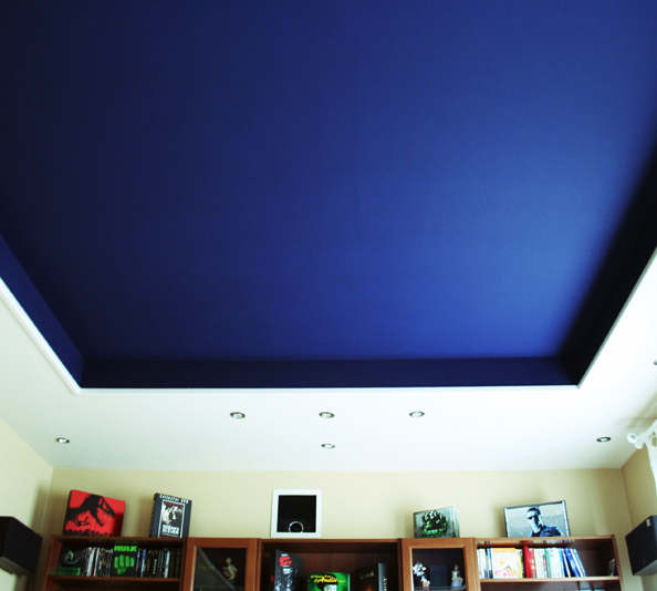 Le plafond peint, j’ai pu fixer les bandes de papier et ainsi repérer où planter mes clous sans tête.