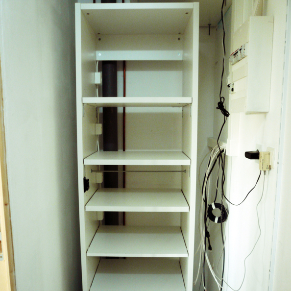 - Pose d’équerres sur les 2 premiers niveaux pour supporter le poids d’une TV 36cm, qui me sert d’écran de contrôle et de l’amplificateur A/V ONKYO TX-SR805, qui pèse un peu de moins de 30 Kg !